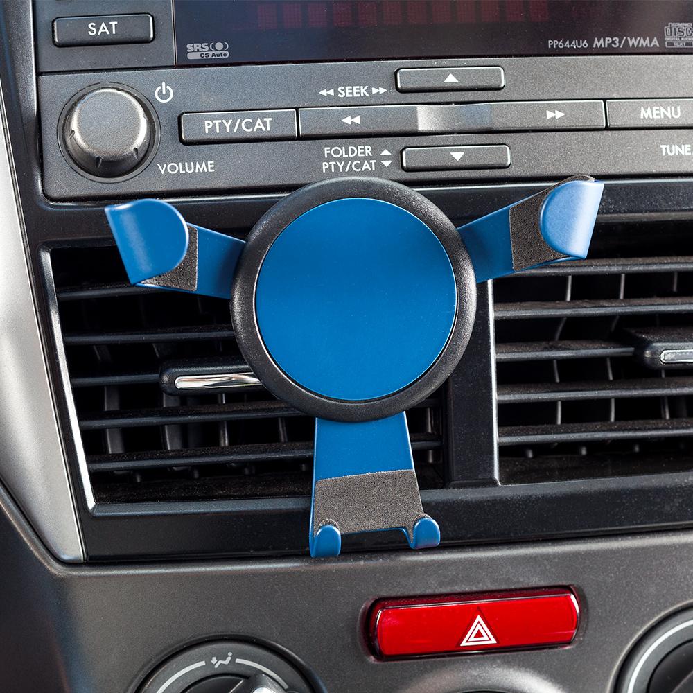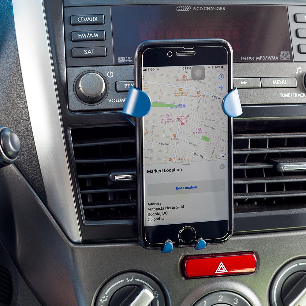 Set de soporte ajustable para móviles, para colocar en la rejilla del aire acondicionado de carro. Con llavero metálico. Empaque Caja Individual.